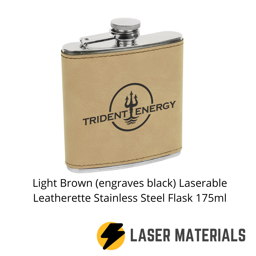 This 175ml stainless steel hip flask is covered in light brown leatherette which can be laser engraved to make a personalised gift or promotional product.